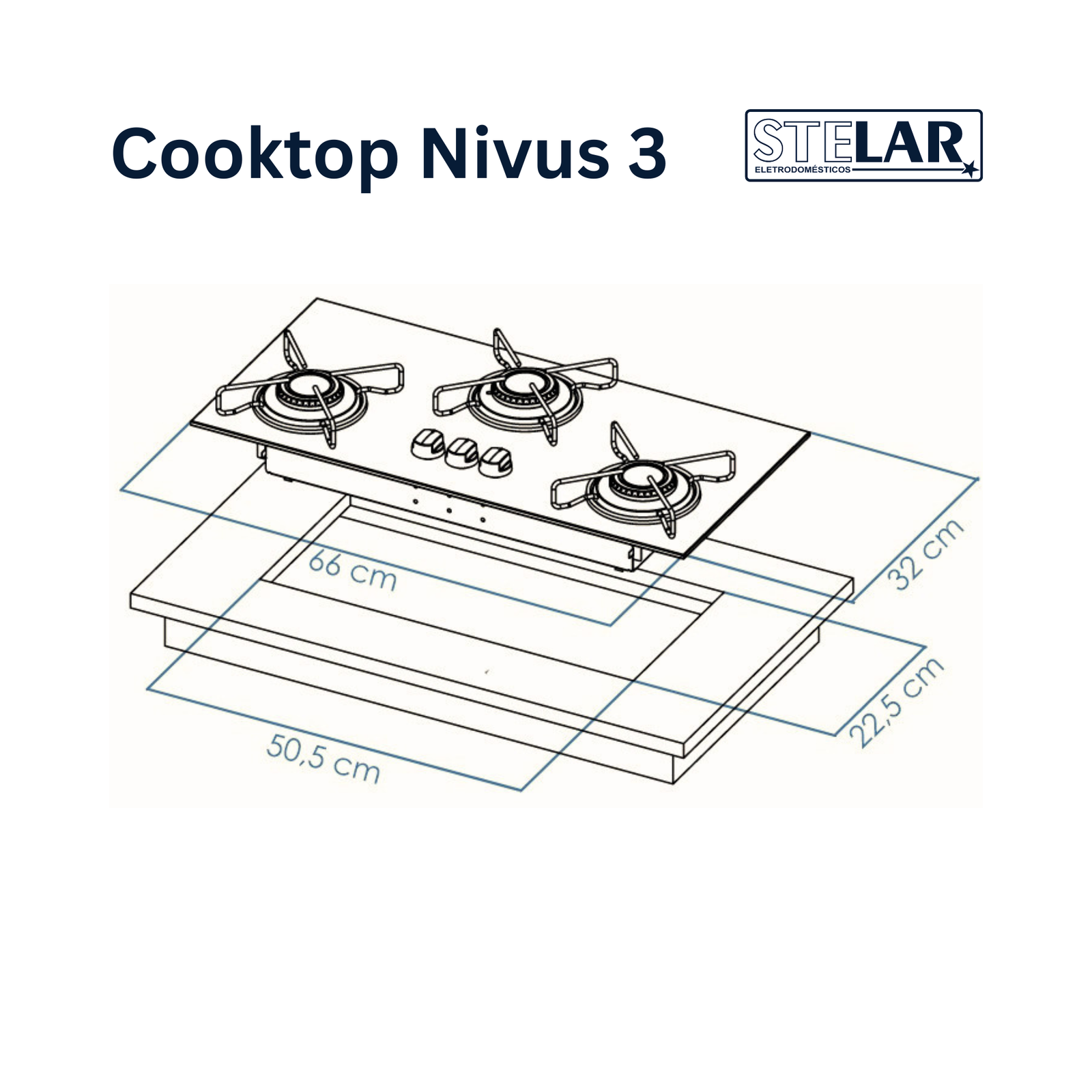Dimensões Compactas: Com medidas ideais de 5 x 66 x 32 cm (Altura x Largura x Profundidade), nosso cooktop se encaixa perfeitamente em diferentes tipos de bancadas, otimizando o espaço disponível e oferecendo flexibilidade no posicionamento dos queimadores.
